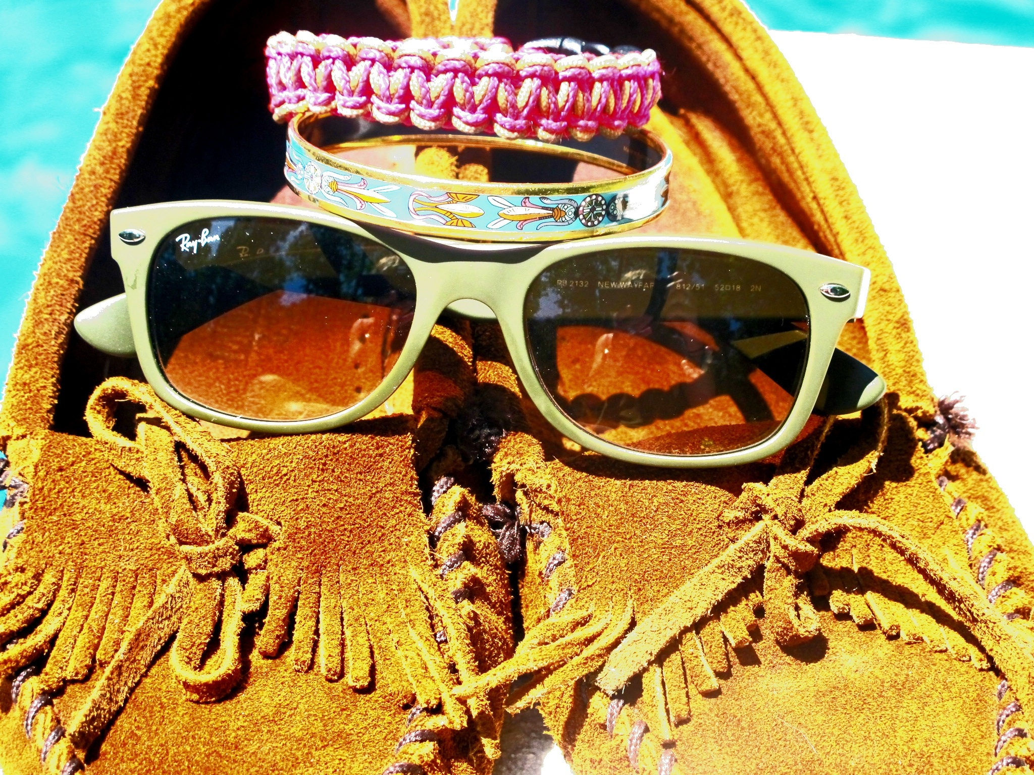 Simple little things that I will carry with me every week end this summer: My Minnetonka Mocassins,ray ban sunglasses in a cool army green color,some bright colors bracelets ,one from Hermes and one from some outside market in Massachusetts.